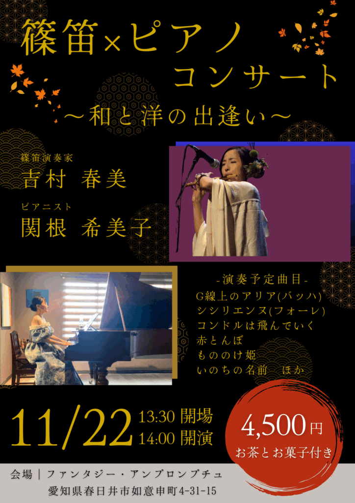 秋深まる11月22日(土)に、篠笛とピアノによる特別なコンサートを開催することになりました。