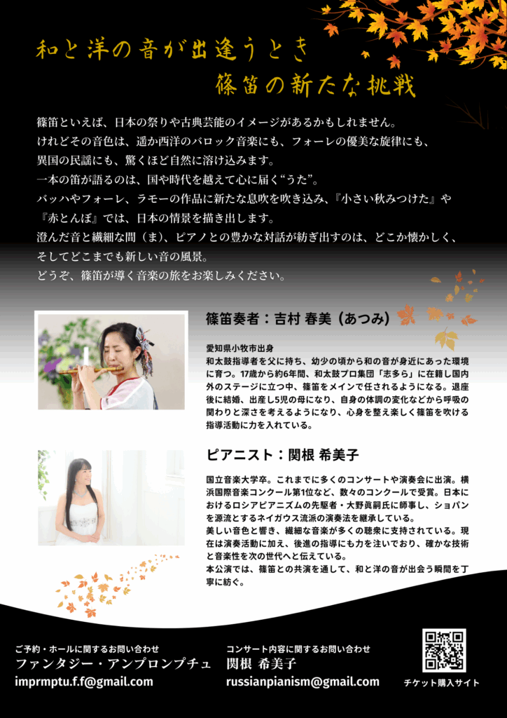 この公演では、和の風情を感じさせる篠笛と、西洋の響きを持つピアノが寄り添い、バッハやフォーレ、サティといったクラシック音楽の作品、そして「小さい秋見つけた」「赤とんぼ」など、日本人の心に深く響く名曲の数々をお届けします。